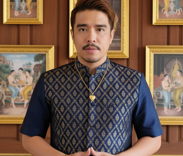 ผู้ชายสวมชุดไทยประยุกต์ เสื้อสีน้ำเงินเข้มลายทอง กางเกงโจงกระเบนสีน้ำเงินเข้ม สร้อยคอทองคำจี้รูปหัวใจเล็กๆ กำไลทองที่ข้อมือซ้าย ผมสั้นทรง Two Block Cut สไตล์โอปป้าเกาหลี ใบหน้าเหมือนต้นฉบับ ผิวเรียบเนียน ชุ่มชื้น ดูสุขภาพดี ยืนประสานมืออยู่หน้าฉากหลังที่เป็นห้องไม้แกะสลักสีทองงดงาม