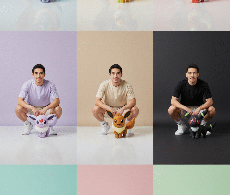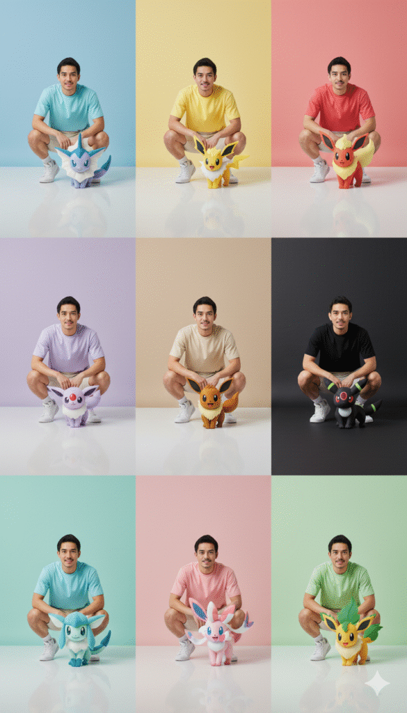 “A colorful 3×3 collage of a young fit man as attached with short black hair, posing in a professional studio with all Eeveelutions (Eevee and its evolutions). Each panel has a different solid pastel background color matching the Pokémon type. The man wears casual summer outfits: colored t-shirts that match the background, beige or gray shorts, and white sneakers. He is squatting or crouching next to each Pokémon with natural friendly poses. Pokémon lineup per panel: Vaporeon with blue background, Jolteon with yellow background, Flareon with red background, Espeon with lavender background, Eevee with beige-brown background, Umbreon with black background, Glaceon with turquoise background, Sylveon with pastel pink background, and Leafeon with green background. Clean white floor, soft bright studio lighting, minimalist modern aesthetic, magazine-style photoshoot.”