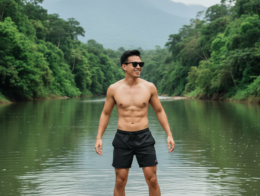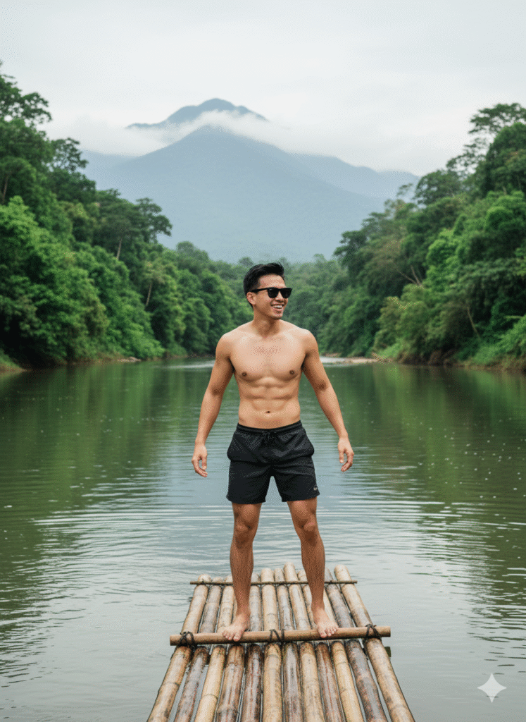 ”A fit young man with sunglasses, wearing black swim shorts, stands barefoot on a bamboo raft in the middle of a wide river. He is smiling and looking to his right. The river banks are lush with green trees and foliage, and mountains are visible in the distance under an overcast sky.”