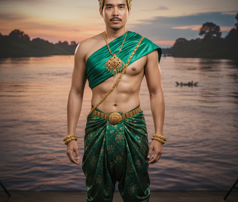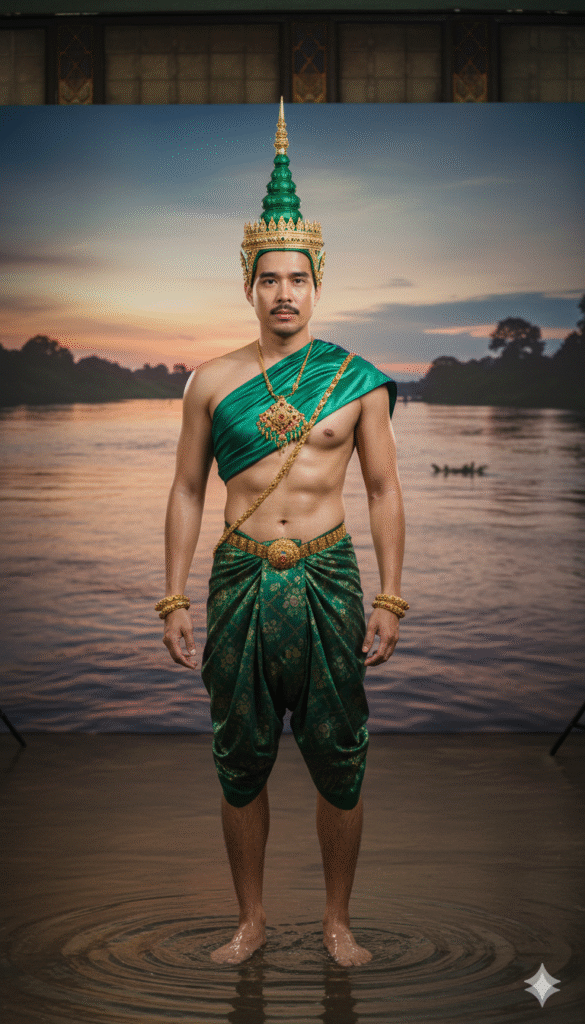 สร้างภาพถ่ายบุคคลในภาพ โดยอ้างอิงจากภาพบุคคลต้นแบบให้เหมือน 100% ใบหน้าสมจริง รูปร่างสมส่วนแบบชายไทย สีผิวขาวสวยงาม ใส่ มงกุฎรูปพญานาค มีหัวเดียว หันมาตรงหน้ากล่อง สีเขียวมรกต สลับสีทองเล็กน้อยโชว์หุ่นซิกแพคสวยงาม มี ผ้าพาดบ่า เฉียงมาทางซ้าย ดูไม่แน่นเกินไป สีเขียวมรกตเงางาม พร้อมสังวาสสีทอง สวม ใส่ผ้าถุง โจงกระเบนโจงกระเบนมีลักษณะเหมือนเปียกน้ำ ลายสร้อยดอกหมาก สีเขียวมรกต ภาพถ่ายแบบเต็มตัว แล้วจะมีน้ำเคลื่อนไหวเป็นแบบวงกลม