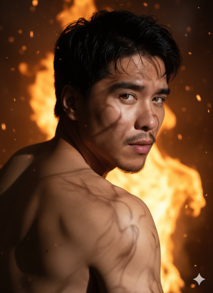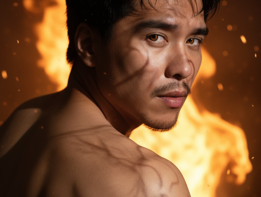 The background is flaming fire around him light-colored, likely a bursting fire, which keeps the focus entirely on the subject.