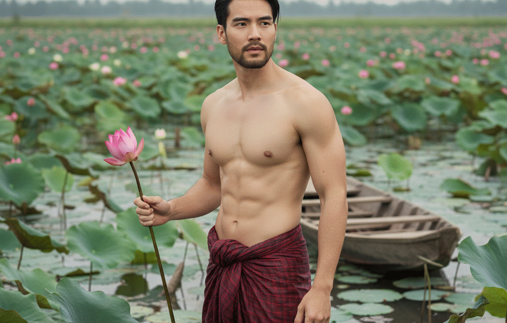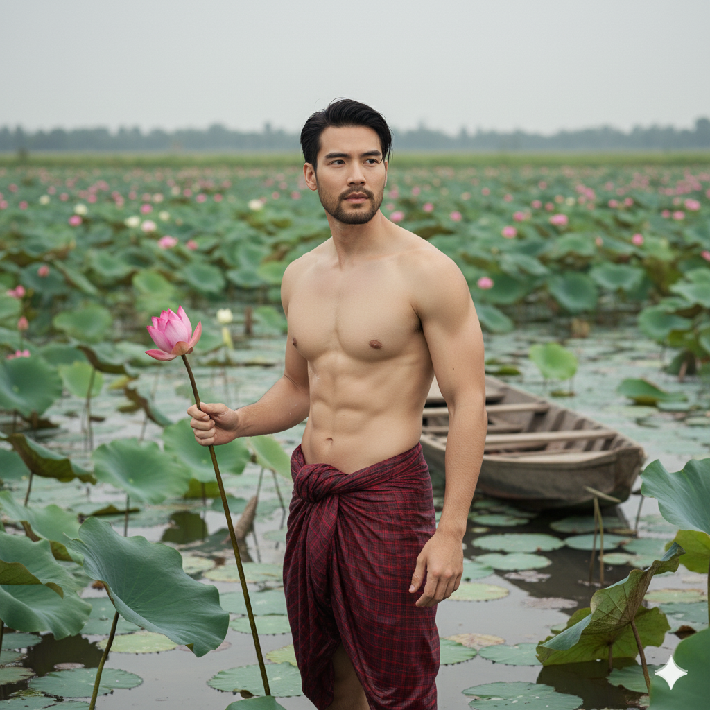 ภาพเหมือนที่สมจริงของชายหนุ่มคนหนึ่งโดยยังคงใบหน้าเดิมของภาพที่อับโหลดนี้ 100% ยืนเอียงข้างเล็ก น้อยในบ่อ ดอกบัว ไม่ใส่เสื้อมีรูปร่างดีพอประมาณ มีกล้ามเล็กน้อย กล้าม ท้องไม่ต้องชัดมาก ใส่ผ้าซำม้าสีแดงลายตากะโลบางๆที่เปียก น้ำ ทรงผมของเขาเปียกน้ำเล็กน้อย มือถือดอกบัว ที่เก็บแล้วขึ้นมาจากน้ำที่ล้อมรอบด้วยดอกบัวสีเขียวและดอกบัว ใกล้ๆมีเรือเล็กลอยในบ่อบัว เป็นจริง