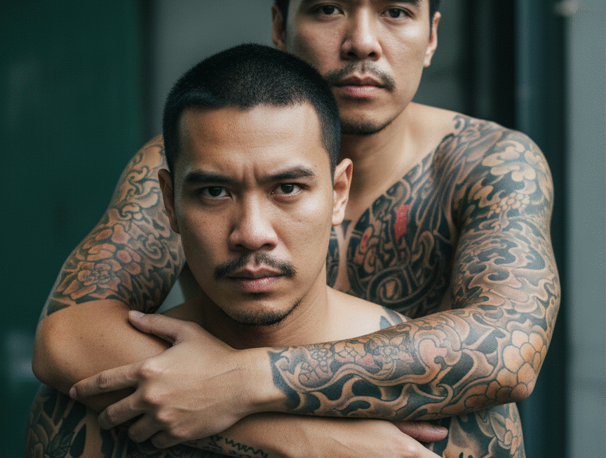 เขาถอดเสื้อ มีรอยสักแบบเอเซียหนาแน่นทั้งตัว และมีผมสั้นเกรียน ดวงตาของเขาแสดงออกถึงความมุ่งมั่นหรือความตึงเครียด